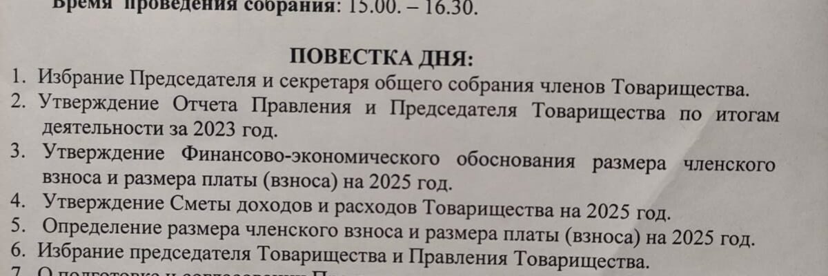 Уважаемые собственники земельных участков! Уведомляем вас о проведении очередного собрания членов ТСН СНТ…